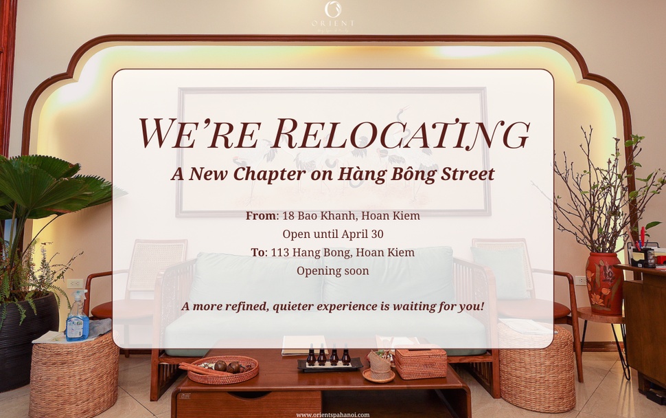For 10 years, Orient Spa has been your sanctuary in the heart of Hanoi. As we continue to evolve, we are thrilled to share a new chapter - Our Hoan Kiem Lake branch at 18 Bao Khanh Street is relocating to a beautiful cozy new home at 113 Hang Bong Street, just a 7-minute walk away.